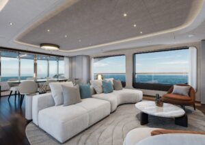 Gli interni, curati da Acube Design, esprimono un’estetica organica e sofisticata con linee morbide, materiali naturali e ambienti inondati di luce grazie alle ampie superfici vetrate. Sul main deck il salone principale è concepito per la massima flessibilità, mentre la suite armatoriale full-beam si distingue per la luminosità, la vista panoramica e dettagli raffinati come ampio bagno en suite finestrato, una generosa armadiatura walk-in closet, angolo beauty con specchio illuminato e un desk trasversale fruibile come tavolo colazione o home office. L’upper deck esteso offre ulteriori configurazioni personalizzabili e una Pilot House indipendente, mentre il lower deck ospita le quattro cabine ospiti, e una zona equipaggio con 5 posti letto, con accessi separati e spazi funzionali. La filosofia progettuale coniuga comfort, eleganza e funzionalità, creando ambienti accoglienti e raffinati, pensati per essere vissuti in ogni momento della giornata.