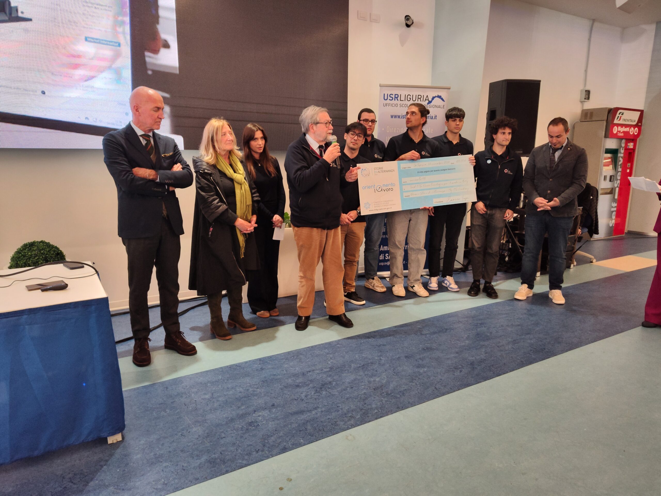 Nella foto con il Presidente Roberto Sgherri gli studenti della Fondazione I.T.S Academy La Spezia per il Made in Italy ritirano il premio nel salone del Terminal Crociere della Società Spezia Carrara cruise terminal.