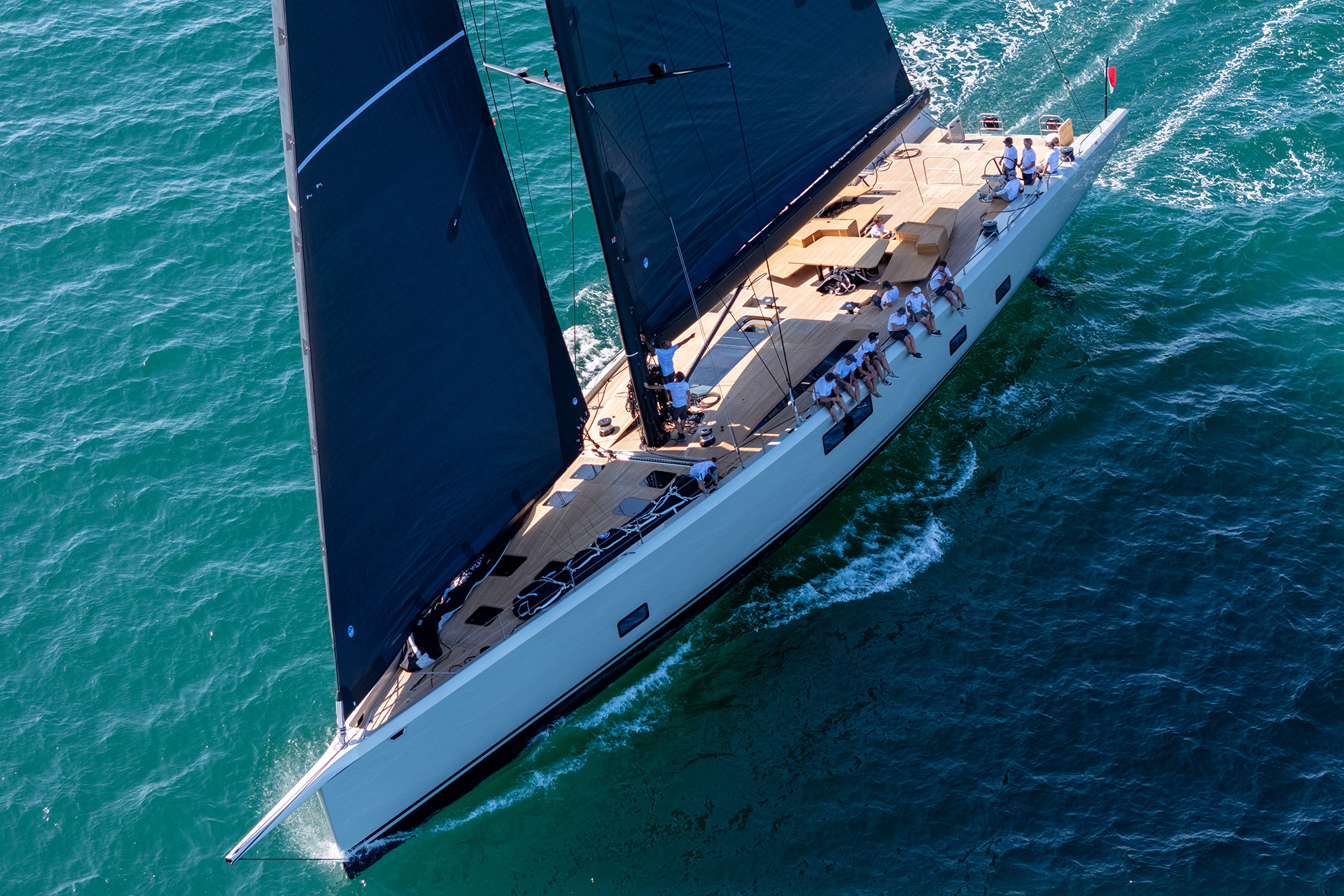 Varato nel 2025 e lungo 33,42 m, il wallywind110 unisce ingegneria avanzata ed eleganza, con scafo e sovrastruttura in fibra di carbonio e ponte in teak, in un equilibrio tra leggerezza strutturale e solidità.