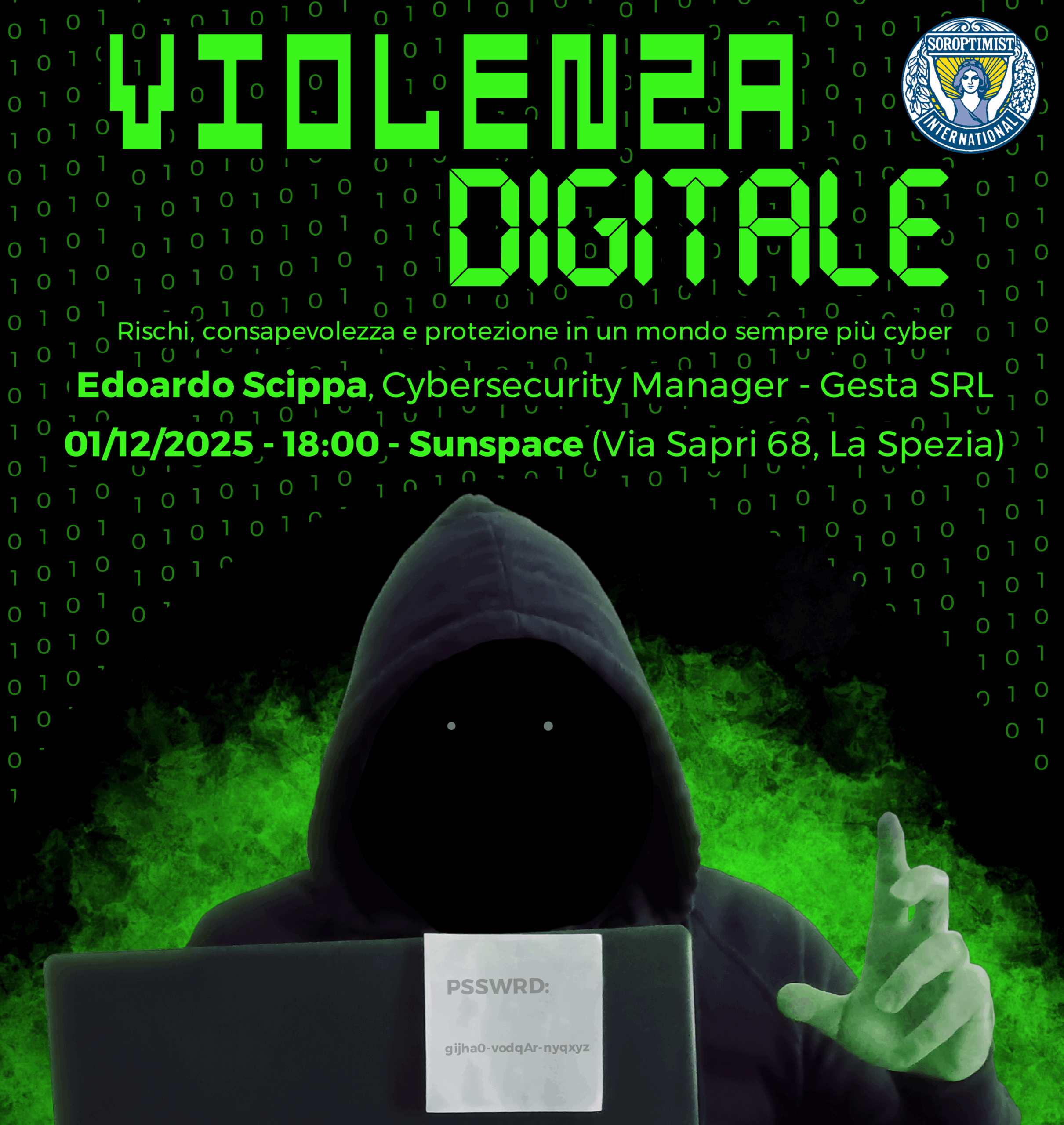 L’evento, intitolato “Violenza digitale: rischi, consapevolezza e protezione in un mondo sempre più cyber”, organizzato in collaborazione con Gesta Srl, si terrà il 1° dicembre 2025 alle ore 18 in Sunspace, in via Sapri 68 alla Spezia, con il patrocinio del