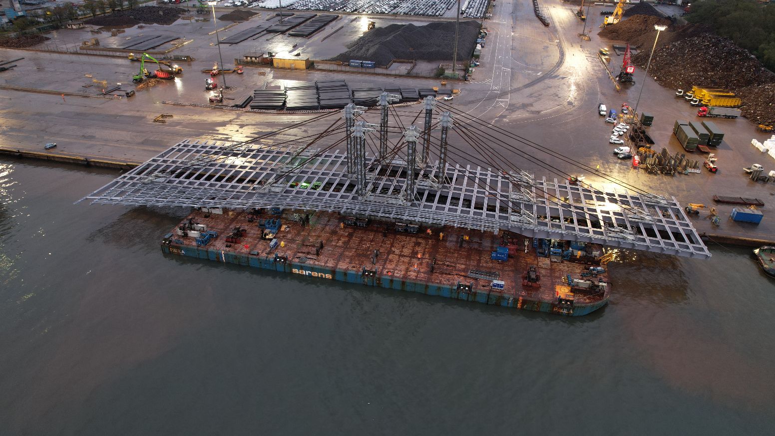 L’elemento principale pesa circa 2.000 tonnellate, a cui si aggiungono oltre 1.000 tonnellate di strutture provvisorie, per un totale di circa 3.000 tonnellate caricate sulla chiatta, al netto del peso dei carrelloni utilizzati.