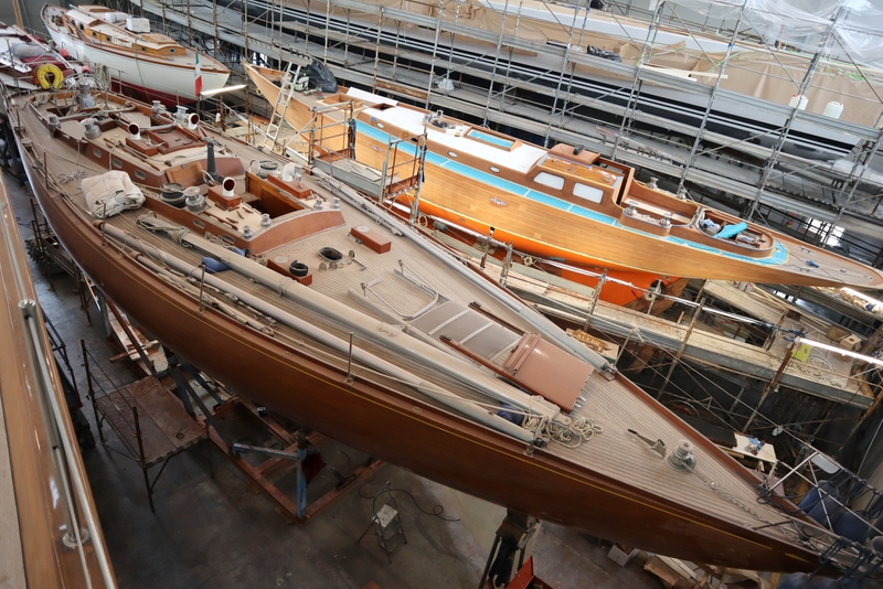 Osservare un capannone pieno di scafi storici in legno conferma il desiderio di tanti armatori di volere continuare a mantenere in vita imbarcazioni dal fascino intramontabile. Tra queste un 30 metri che ha appena compiuto 50 anni e una piccola lancia a vela lunga circa 6 metri disegnata da Carlo Sciarrelli, il Maestro triestino della progettazione di barche classiche. Accanto a loro Alcor, cutter Marconi varato in Francia nel 1966 su progetto di Jean Boudignon e appartenuta ad un ammiraglio francese, tornata ai Cantieri Navali di La Spezia dopo alcuni primi interventi al fasciame di mogano già eseguiti un paio di anni fa. Nazionalità d’Oltralpe anche per Jalina, un “poppa a canoa” varata nel 1946 dal cantiere Jouet su progetto di Eugène Cornu. Infine Aleph, lo splendido yawl Marconi lungo 16 metri di proprietà del cantiere varato nel 1951 dal cantiere tedesco Abeking & Rasmussen su progetto di quest’ultimo. Con il precedente proprietario, lo yachtsman Mario Pirri, successivo armatore di Latifa, aveva attraversato l’oceano Atlantico per quattro volte, di cui tre in solitario. Oltre all’ordinaria manutenzione, su Aleph si è intervenuti per risanare una parte del fasciame in legno di mogano.
