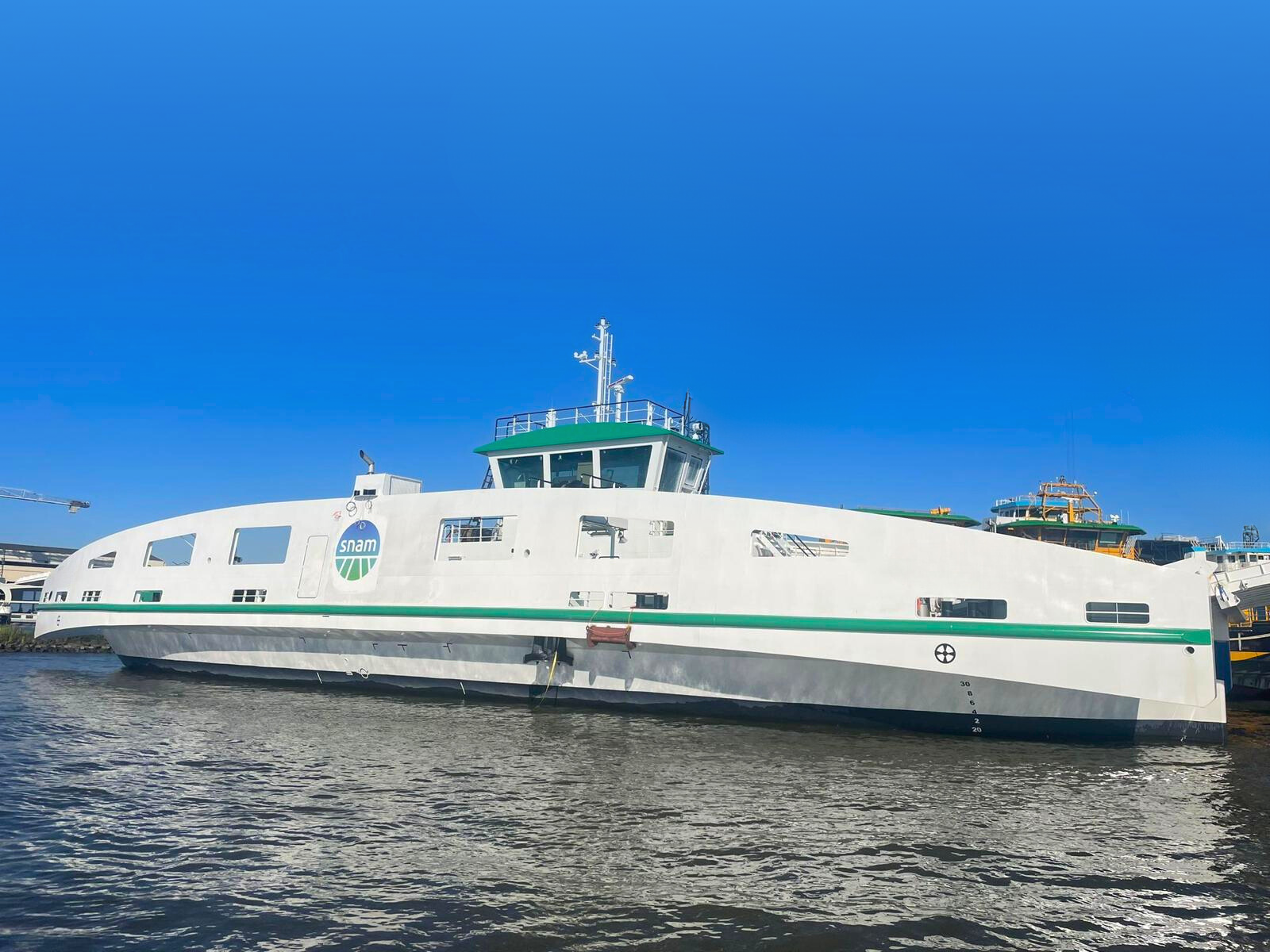 Il traghetto, lungo poco meno di 50 metri e largo 14, è stato realizzato dal cantiere olandese Holland Shipyards, specializzato per questo tipo di mezzi, è stato sbarcato dalla nave Bbc Xingang proveniente dal Porto di Rotterdam ed è destinato al progetto di truckloading che prenderà il via nel primo trimestre del 2025 al terminal Snam dal quale svolgerà il servizio di trasporto di autobotti criogeniche alla banchina dedicata nel Porto della Spezia.