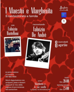 Un evento su prenotazione al numero 347 855 4409. Il costo dell’evento tutto compreso è di € 30. La serata terminerà entro le ore 23. Gli incontri successivi saranno mercoledì 20 maggio su Francesco Guccini, mercoledì 10 giugno su Edoardo Bennato. Una rassegna a cura di Margherita e le sue sorelle, prodotta da Francesco Millepiedi, Federico Cappa e Pietro Balestri di “EVENTI Salute Società Spettacolo”, insieme a “Cattive Strade” di Fabrizio Bartelloni.
