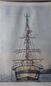 Questo il primo risultato: una bella opera realizzata da Giorgia Marzio, 16 anni, che ha colto in un’ immagine – tratta dai video prodotti insieme ad Obiettivo Spezia e Flyciak per l’esposizione – l’ispirazione per svelare la nave dalla sua poppa, con la sua maestosa alberatura.