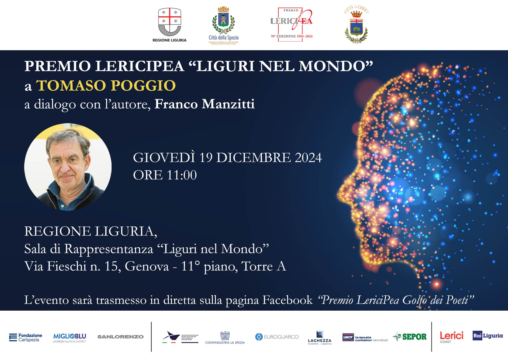 Il Premio LericiPea “Liguri nel Mondo”, giunto alla sua ventesima edizione, nasce per rendere merito e far conoscere tutti i liguri che, attraverso il talento ed il lavoro di una vita, hanno onorato e reso celebre il nome della Liguria nel Mondo; eccellenze come: l’architetto Renzo Piano, la candidata al Nobel Maria Elena Bottazzi, l’etoile Rachele Buriassi, premiata la scorsa edizione e, quest’anno, Tomaso Poggio.