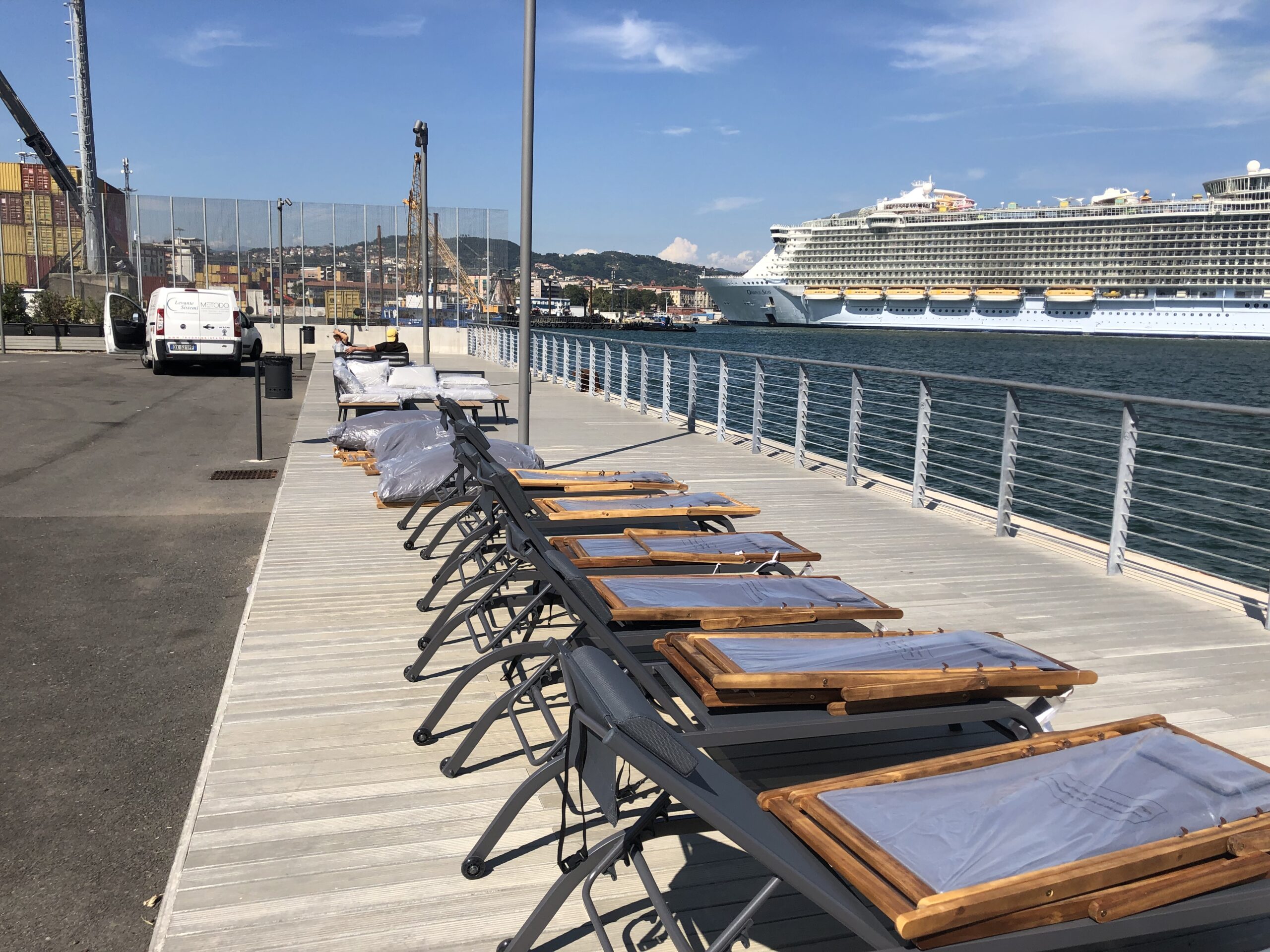Nella foto la Oasis of the Seas al Molo Garibaldi del Porto della Spezia vista da Calata Paita dove gli operatori sono impegnati in febbrili preparativi per l’imminente inaugurazione, operatori che contano anche di ospitare i crocieristi in sosta alla Spezia.