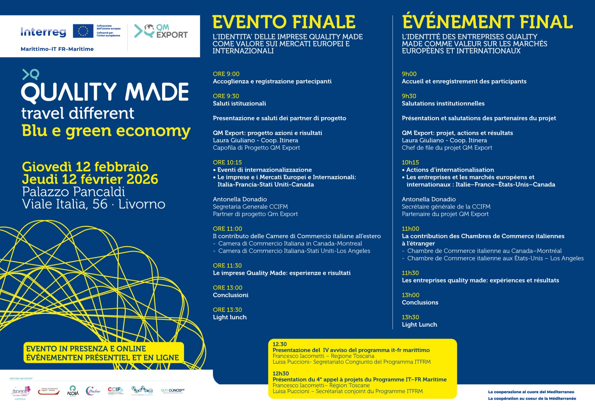 Il progetto QM Export, finanziato dal Programma INTERREG Italia–Francia Marittimo 2021–2027 (Azione 1 – Decreto Regione Toscana n. 27481 del 12/12/2023), è stato coordinato da Itinera Progetti e Ricerche – Cooperativa Sociale di Livorno, capofila del partenariato, che ha guidato l’intero processo progettuale e operativo valorizzando il ruolo strategico della città di Livorno e della costa toscana come laboratorio di cooperazione, innovazione e apertura internazionale.