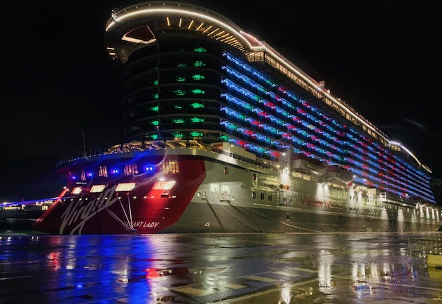 Nella foto la suggestiva immagine notturna della nave Virgin nel Porto di Marina di Carrara