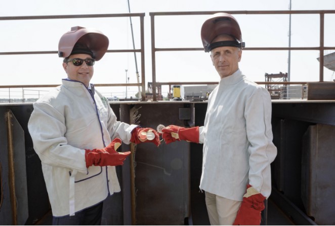 Jonathan Wilson, ceo di Aman at Sea e Marco Ghiglione, ceo di Mariotti, hanno abbassato il primo blocco di lamiera da 200 tonnellate per il nuovo megayacht e posto le monete appena coniate sulla lamiera per augurare buona fortuna alla nave durante la costruzione e le future navigazioni.