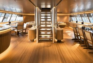 Elemento centrale dello yacht è la scala principale, concepita come fulcro distributivo degli interni. Strutture leggere, corrimani metallici e gradini sospesi si accostano alle essenze lignee, mentre stipiti e dettagli in alluminio verniciato introducono un accento contemporaneo.