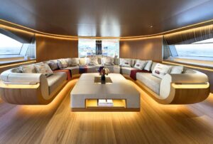 I bagni armatoriali e VIP completano il racconto mediante soffitti in foglia di palladio, piani lavabo in noce e rivestimenti doccia in onice avorio. All’esterno arredi, realizzati in teak con dettagli in acciaio inox, area prendisole con Jacuzzi rivestita in teak, si pongono in soluzione di continuità con gli interni.