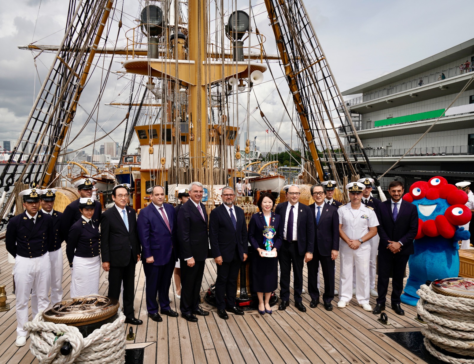 La conferenza è stata preceduta da una photo opportunity (in alto sopra il titolo) a bordo del Vespucci, a cui hanno partecipato i protagonisti, insieme alla mascotte del Padiglione Italia, Italia-chan, e al personaggio ufficiale di Expo 2025 Osaka, Myaku Myaku.