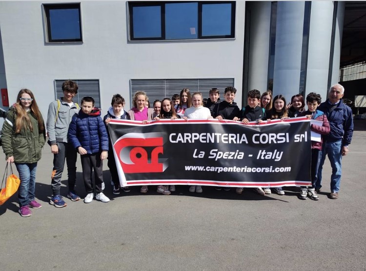 I ragazzi di Castelnuovo Magra (in foto con il fondatore Giocondo Corsi) sono stati accompagnati per tutta la visita alla Società Carpenteria Corsi dal Technical Manager Daniele Brizzi.