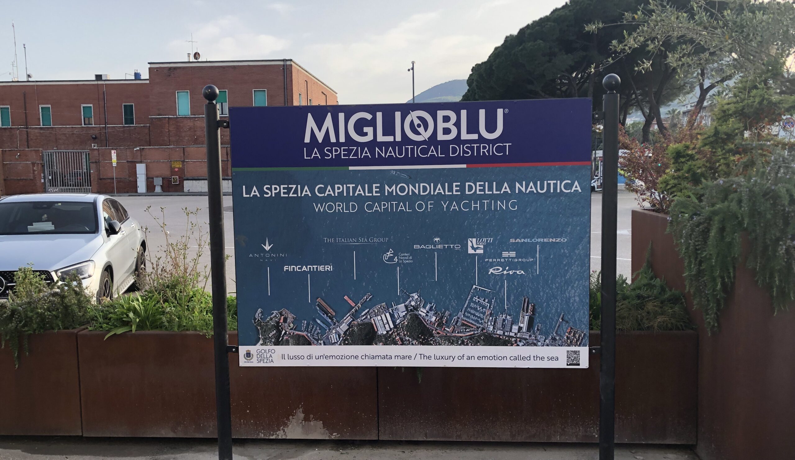 Nella foto il pannello del Miglio Blu davanti al terminal cruise del Porto della Spezia, che è uno dei pannelli promozionali che accolgono i turisti