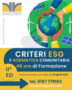 Ricordiamo che le iscrizioni al corso del Bando Esg resteranno aperte fino alle ore 14:00 del prossimo 10 aprile 2026. Nel rispetto dei termini previsti, le domande possono essere consegnate alla Scuola Nazionale Trasporti e Logistica, in orario 09:00-14:00. In caso di spedizione postale, NON FARA’ FEDE IL TIMBRO POSTALE.