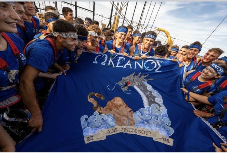 Intanto sulla nave, che è entrata nelle acque del Giappone, era nato, nei giorni della navigazione nelle acque dell’Oceano Pacifico il corso Okeanos in lettere greche (con sottotitolo la sfida in latino: “Qui contra nos?”), nome scelto dai cadetti del primo anno dell’Accademia navale di Livorno in addestramento nel veliero.