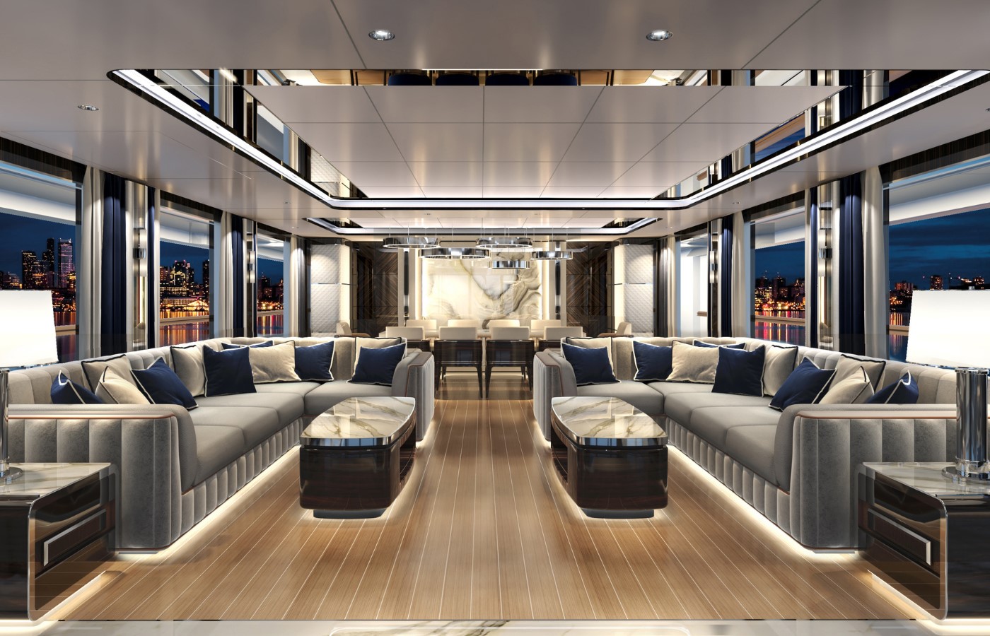 Anche questo T52 presenta le innovazioni stilistiche che caratterizzano la linea, come la poppa aperta con un beach club su tre livelli, la piscina con pavimento a movimentazione up/down che si chiude “a scomparsa” consentendo di ampliare lo spazio del ponte quando non è in uso, ed infine il suo ponte sole della lunghezza di 24 metri.