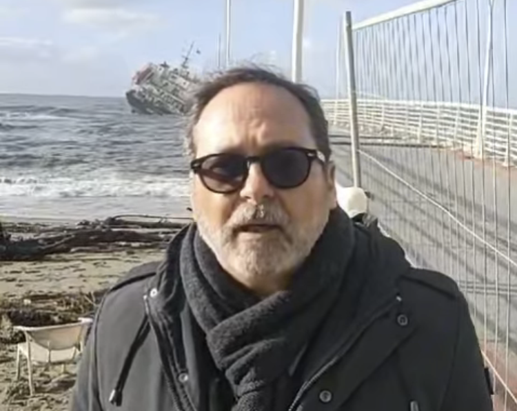 Nella foto il sindaco di Massa Francesco Persiani con sullo sfondo il pontile simbolo di Marina di Massa e la nave incagliata.