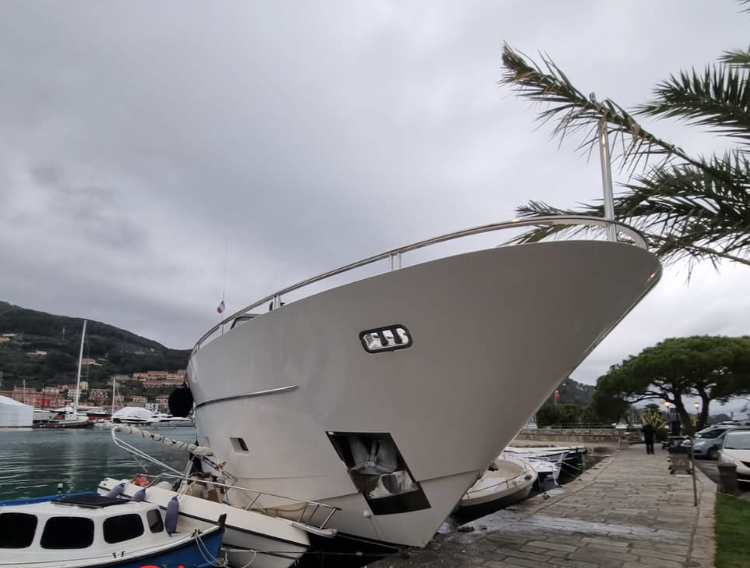 E nella baia delle Grazie è anche avvenuto che uno yacht, rotti gli ormeggi, è venuto in collisione con una barca che è affondata ed è andato poi in collisione contro il molo di Ria, (nella foto di Paolo Varella) .